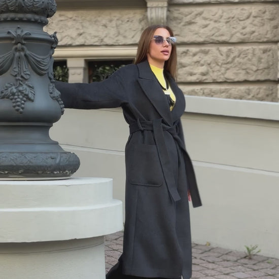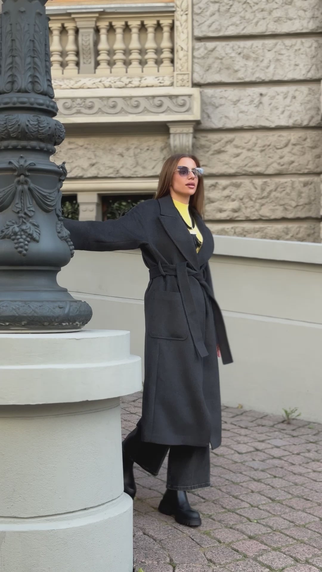 A long coat with a belt that accentuates the waist. The garment has a classic design with wide lapels and large patch pockets. The loose fit ensures comfort and makes it easy to combine with different outfits, while the belt adds a slimming effect to the silhouette. Thanks to the high-quality composition, which includes soft and warming wool, the coat is perfect for the cold autumn-winter season, keeping you warm and comfortable. This is a versatile choice that pairs well with both restrained and more relaxed styles.