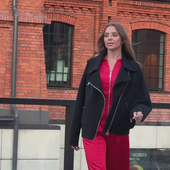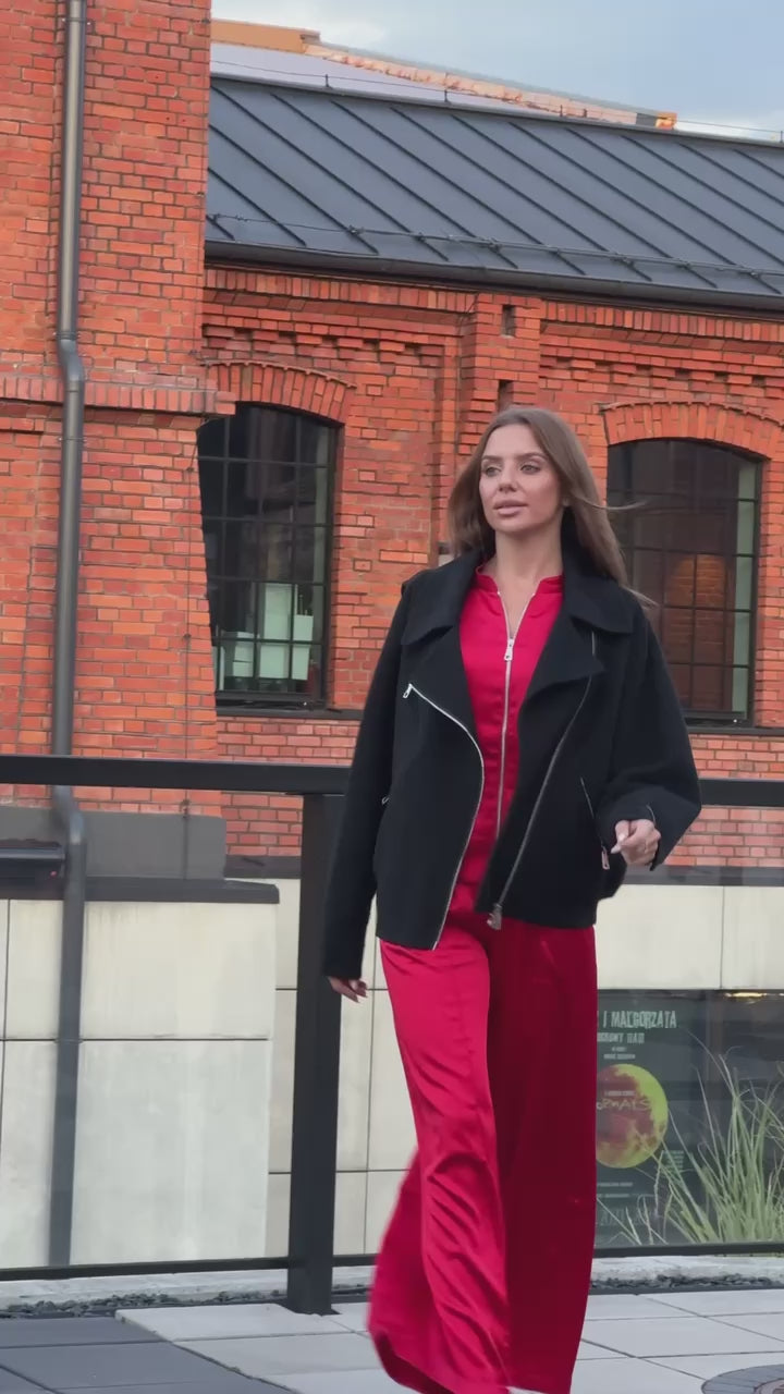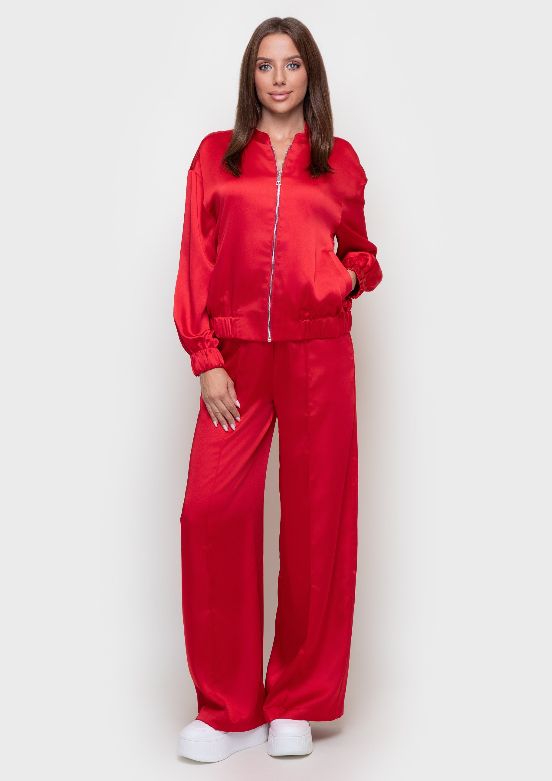 Introducing a stylish silk suit that combines comfort and sophistication. The light and shiny fabric gives your look elegance and softness. The zip-up top features a relaxed fit and elastic cuffs, ensuring comfort throughout the day. The wide high-waisted trousers create a light, airy silhouette, adding a modern touch to your outfit. Perfect for both evening strolls and everyday outings, this suit will highlight your confidence and impeccable taste.