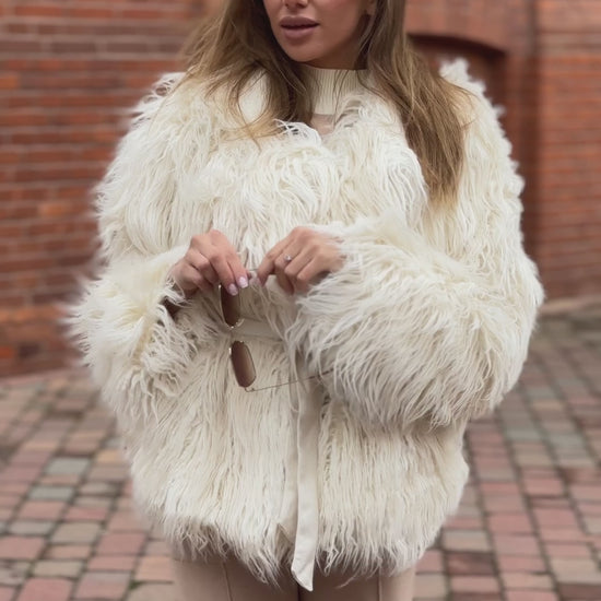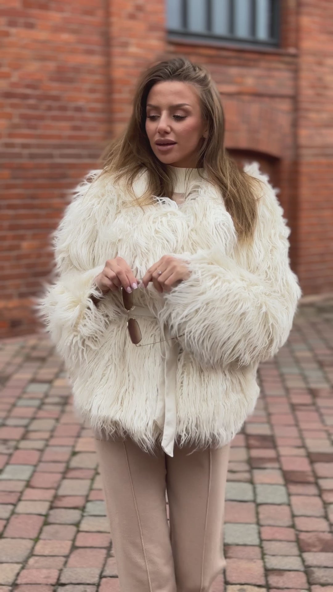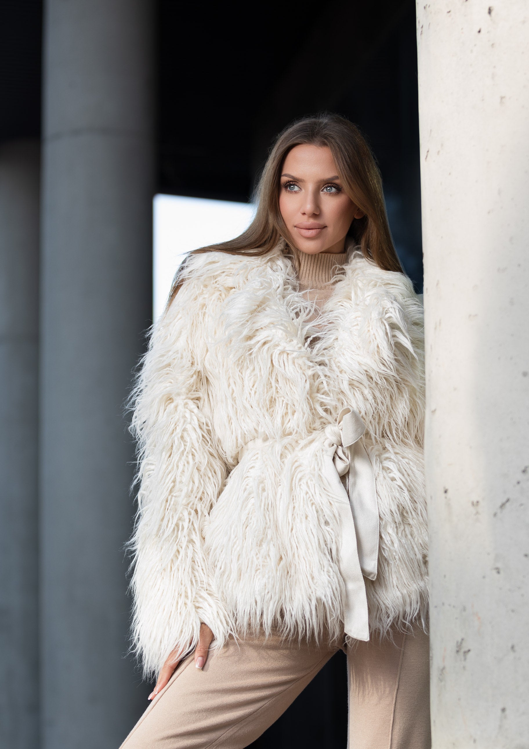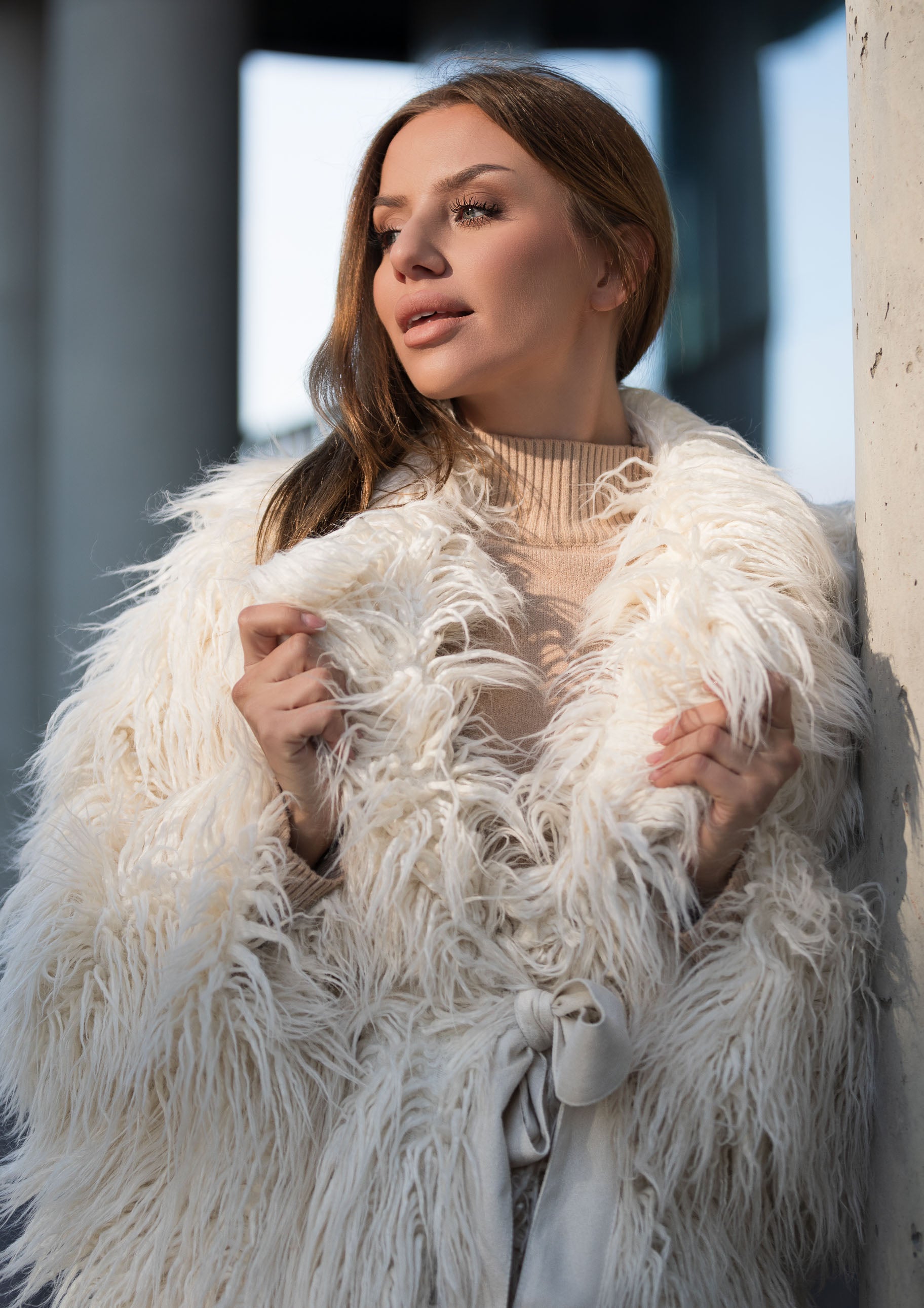 This coat with a belt not only emphasizes the figure, but also adds sophistication to any look. Eco-fur, imitating llama fur, makes the product not only fashionable, but also environmentally safe, which is especially important for modern consumers.