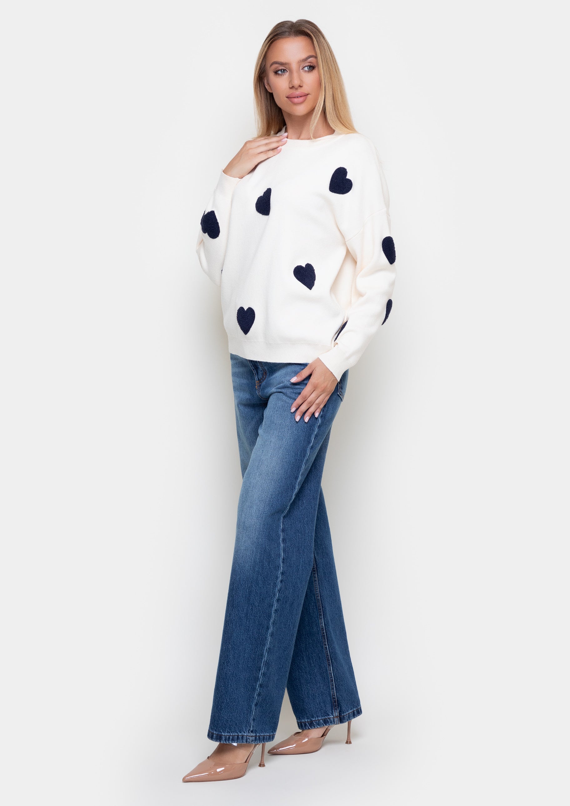 Dedicated to lovers of minimalist style, the sweater with a round neckline and long sleeves fits both casual and more elegant outfits. With its classic, universal milk/black color and subtle rose accents, it perfectly complements any woman's closet. In addition, the hip-length provides a comfortable fit and makes the sweater a perfect match with pants, skirts and shorts.