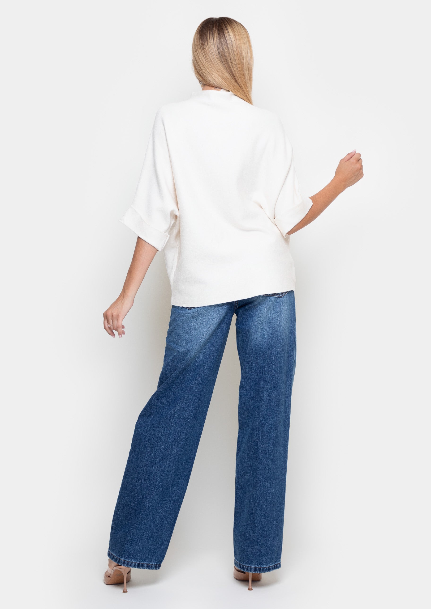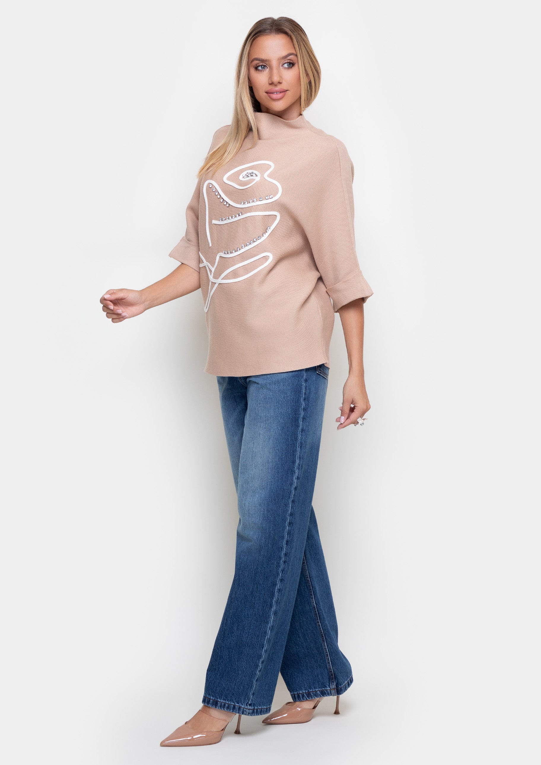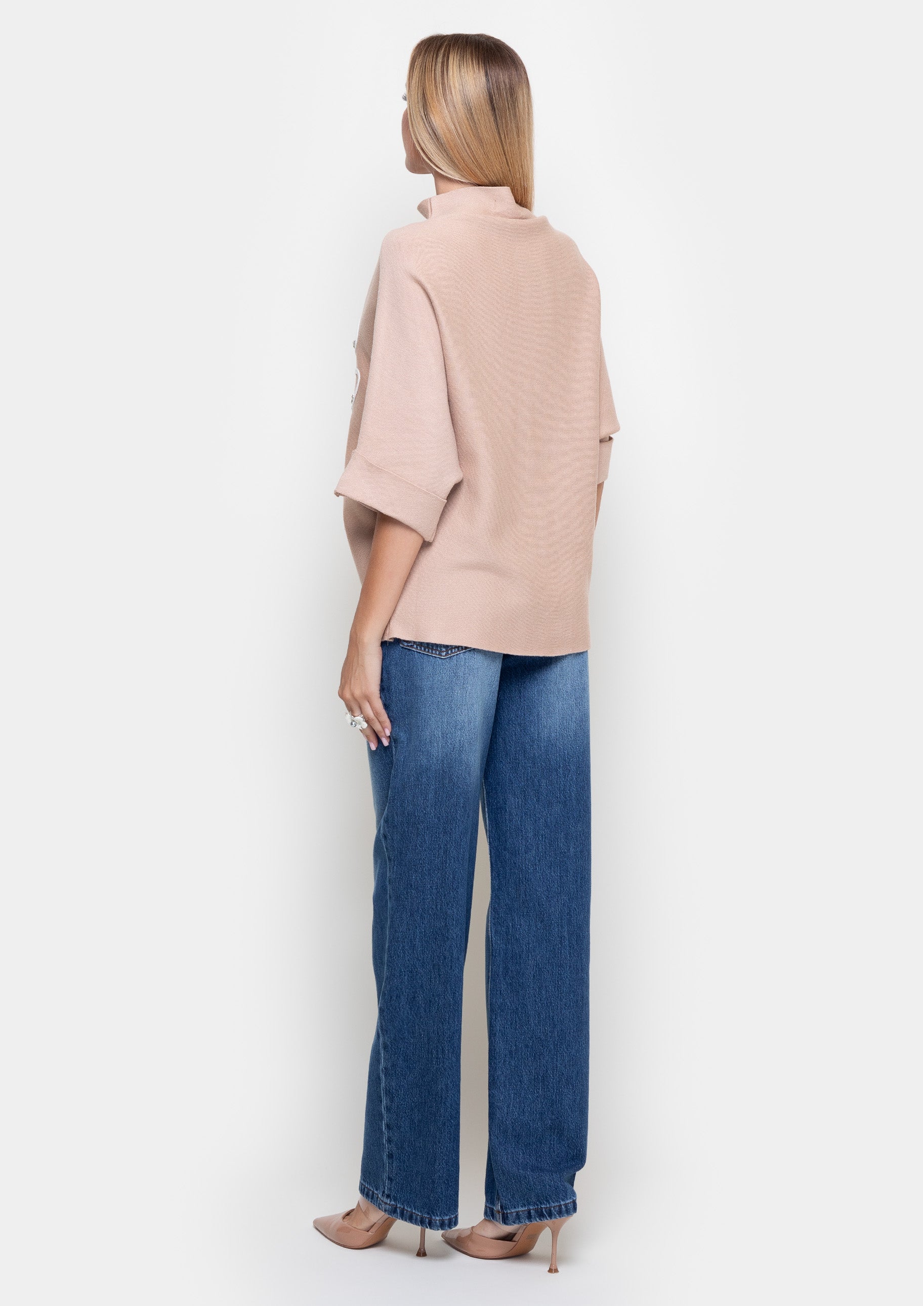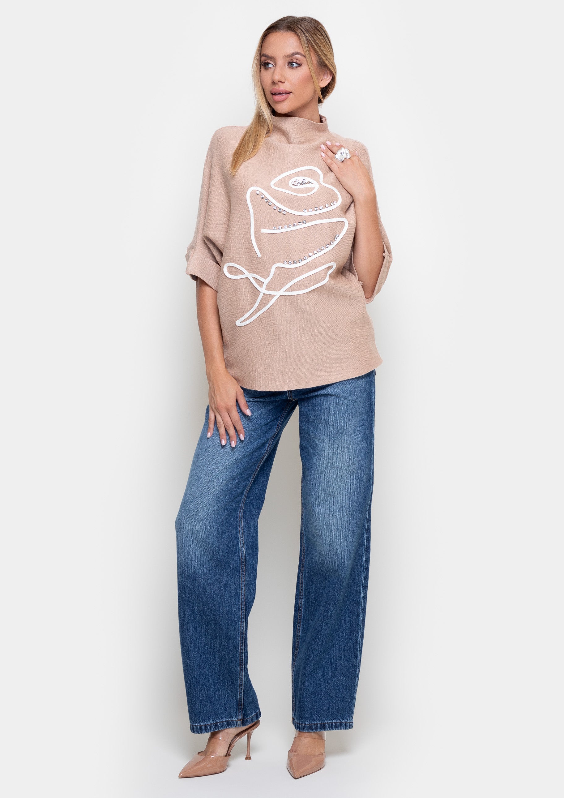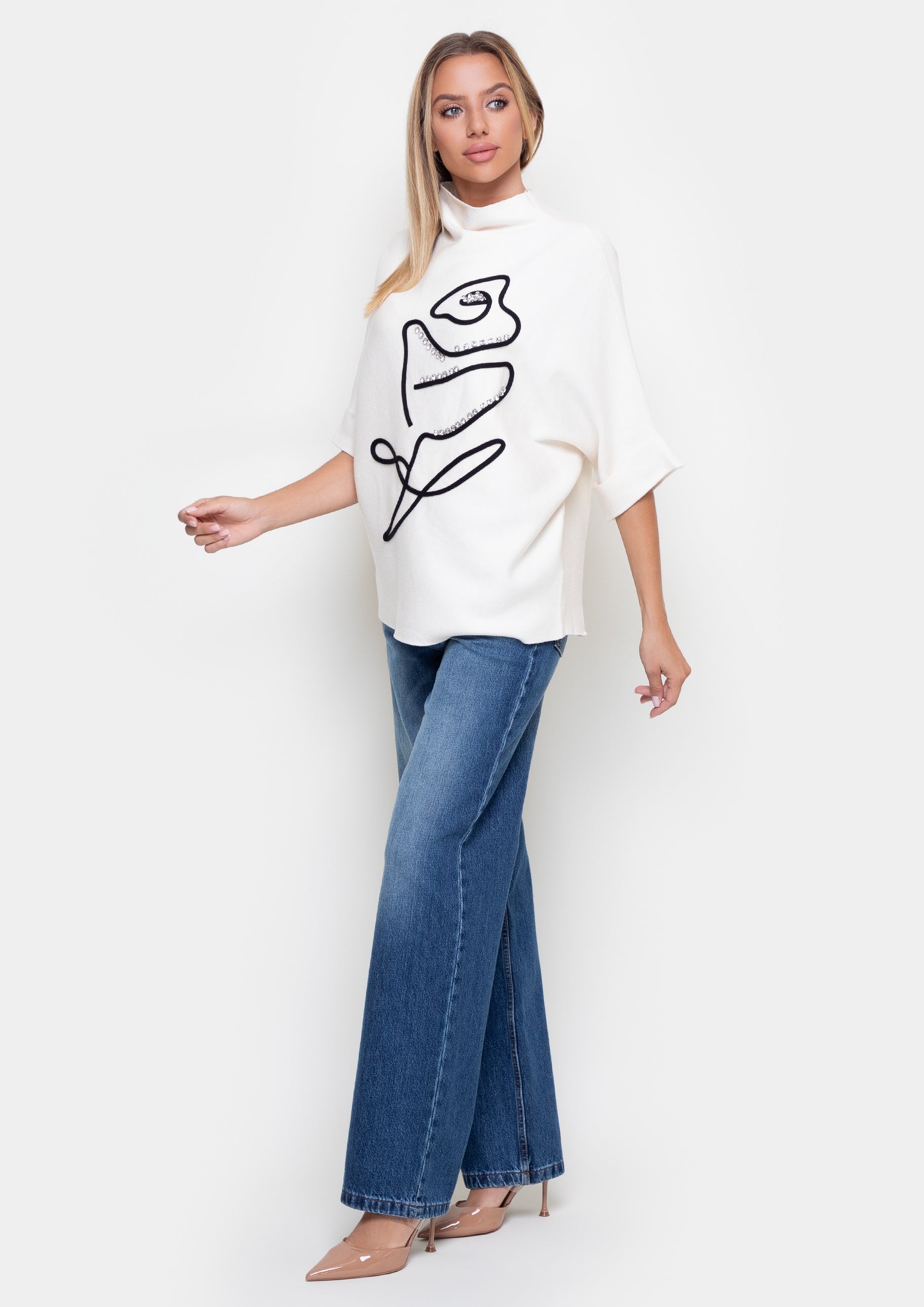 The hip-length jumper is available in a universal ONESIZE size, making it the perfect addition to any wardrobe. It can be easily combined with your favorite pants or skirts to create both casual and more elegant looks. The absence of a fastener makes it easy to put on and take off the jumper, and its classic color with a subtle floral accent adds to its uniqueness.