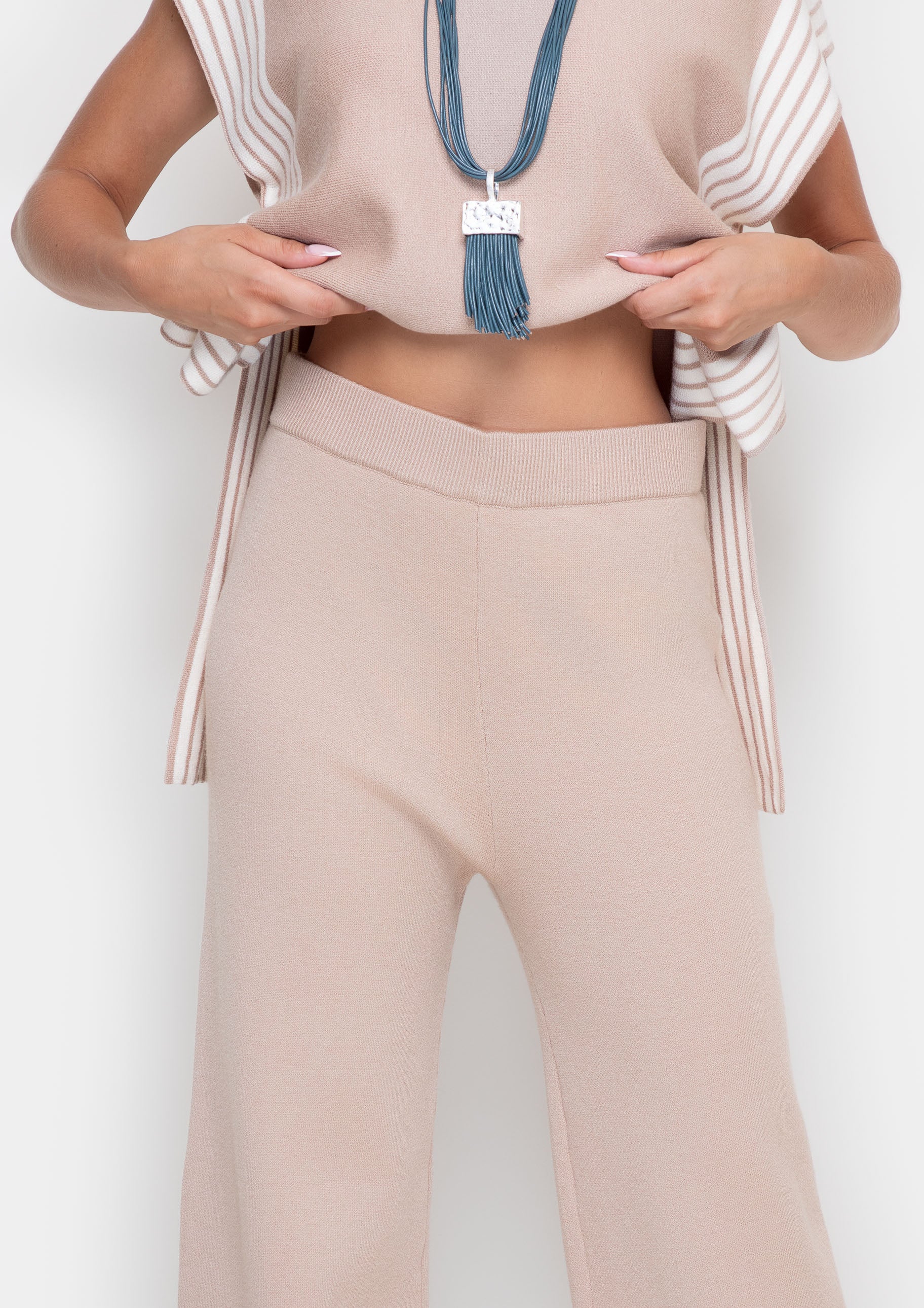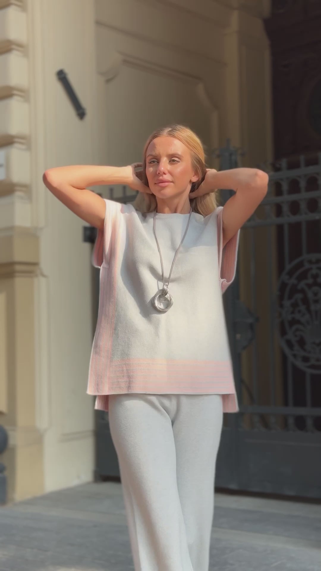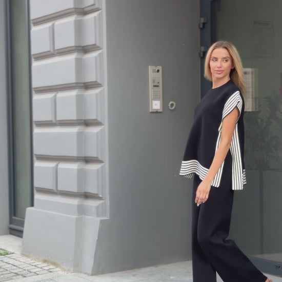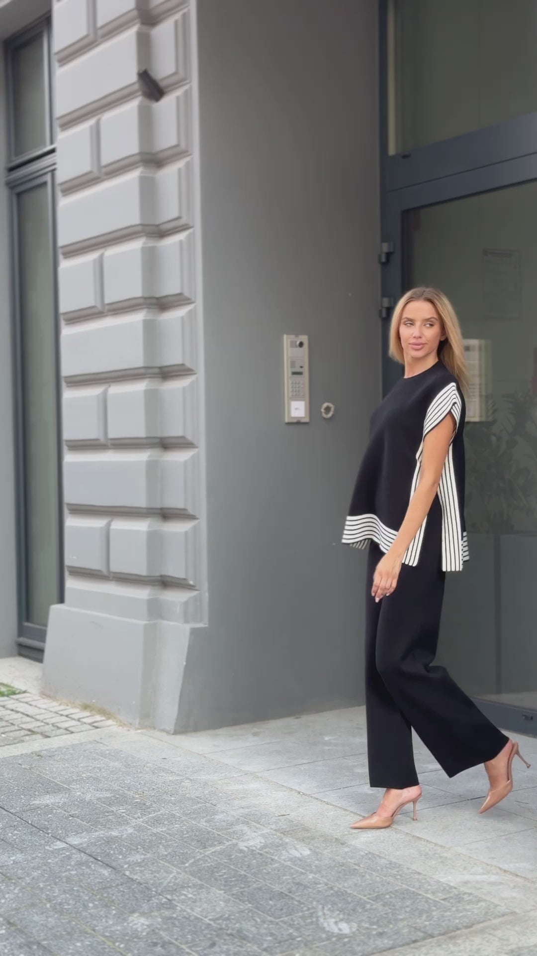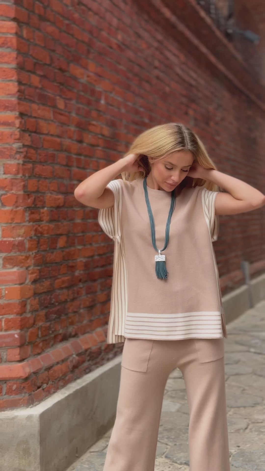 A stylish knit suit with a loose top and wide trousers, designed for maximum comfort and a modern look. The top features a spacious cut and striped accents on the sleeves and edges, adding a fresh and dynamic touch to the outfit. The trousers have a loose fit, ensuring ease of movement and comfort throughout the day. This suit is perfect for everyday wear or casual meetings, highlighting your sense of style and confidence.