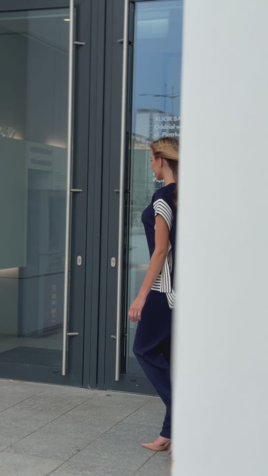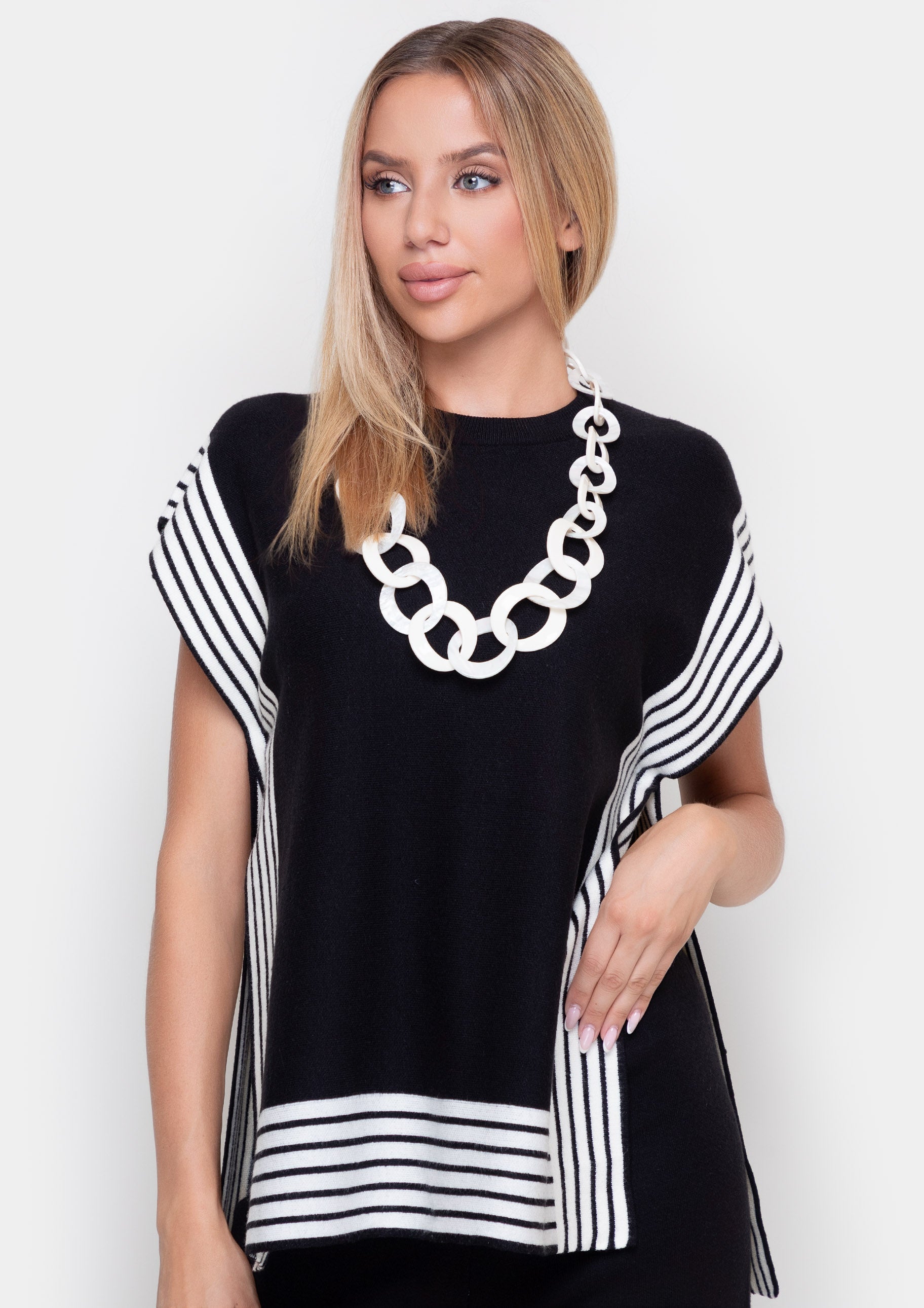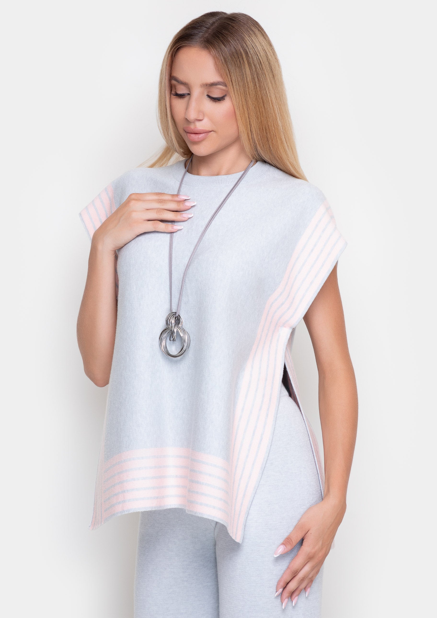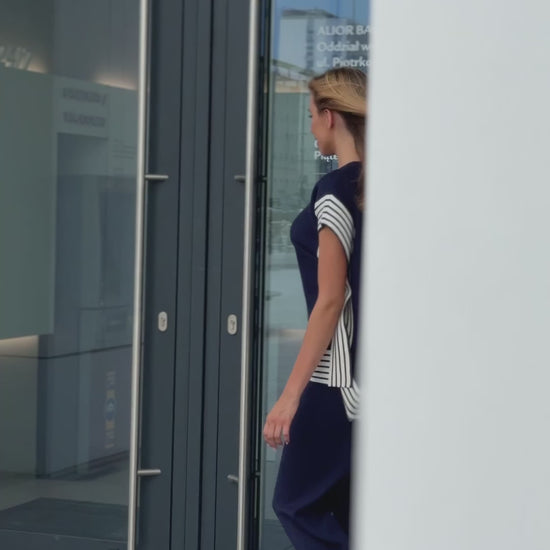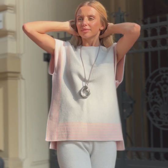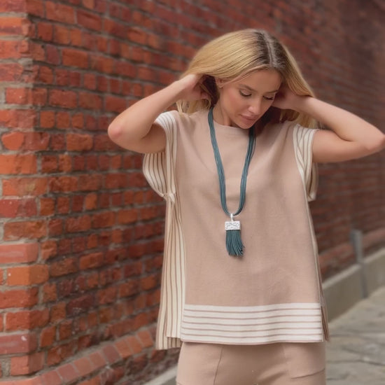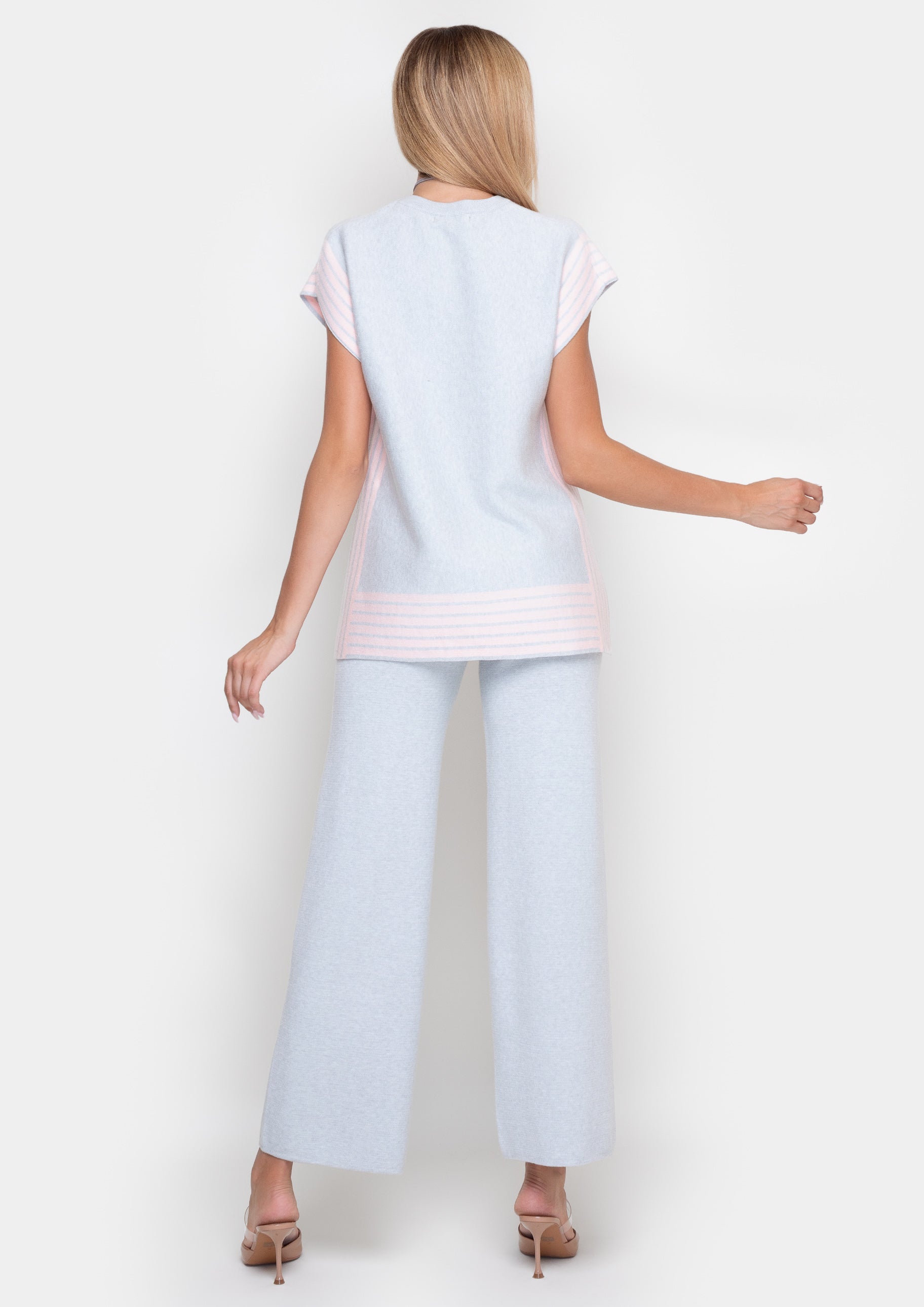 A stylish knit suit with a loose top and wide trousers, designed for maximum comfort and a modern look. The top features a spacious cut and striped accents on the sleeves and edges, adding a fresh and dynamic touch to the outfit. The trousers have a loose fit, ensuring ease of movement and comfort throughout the day. This suit is perfect for everyday wear or casual meetings, highlighting your sense of style and confidence.
