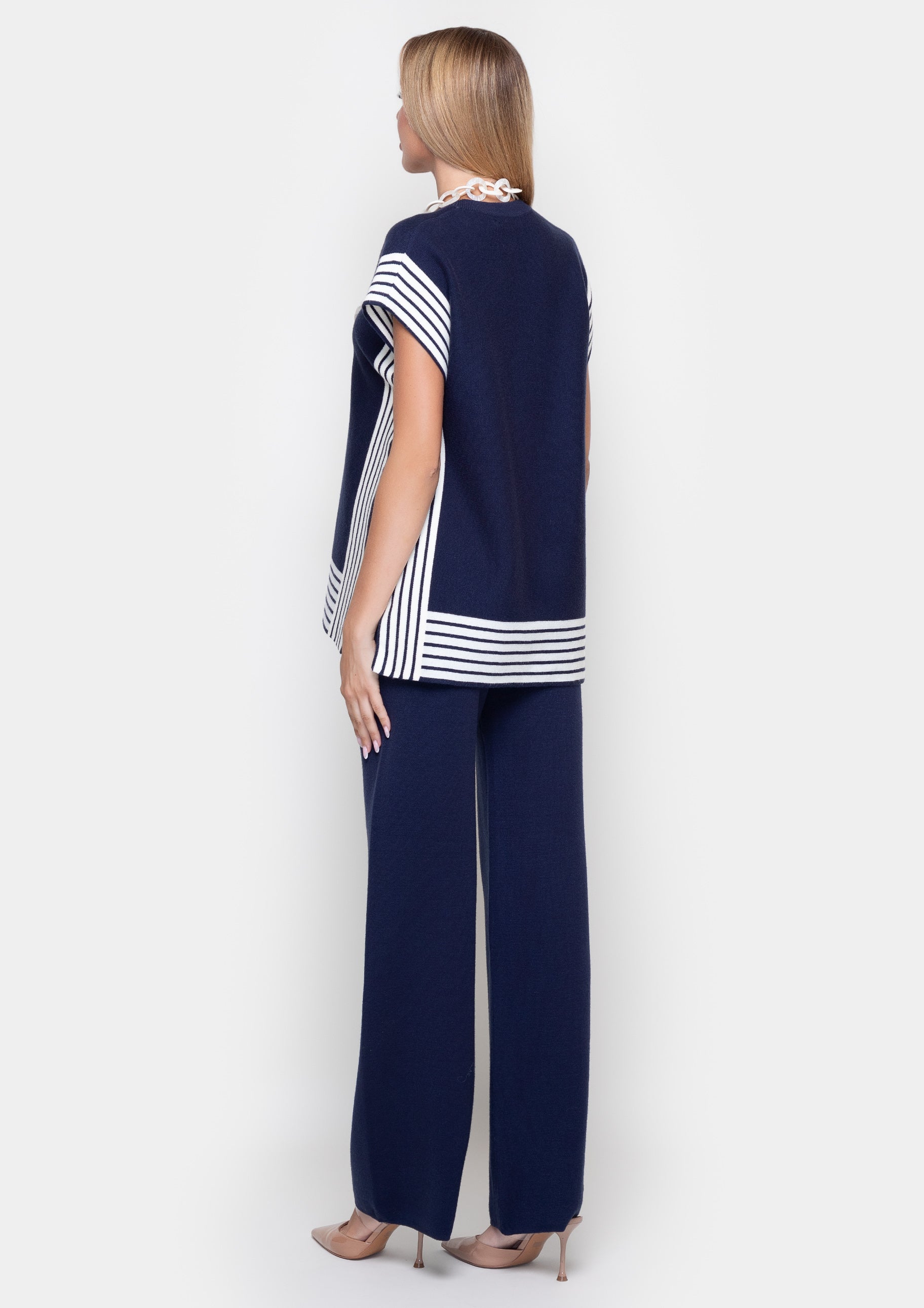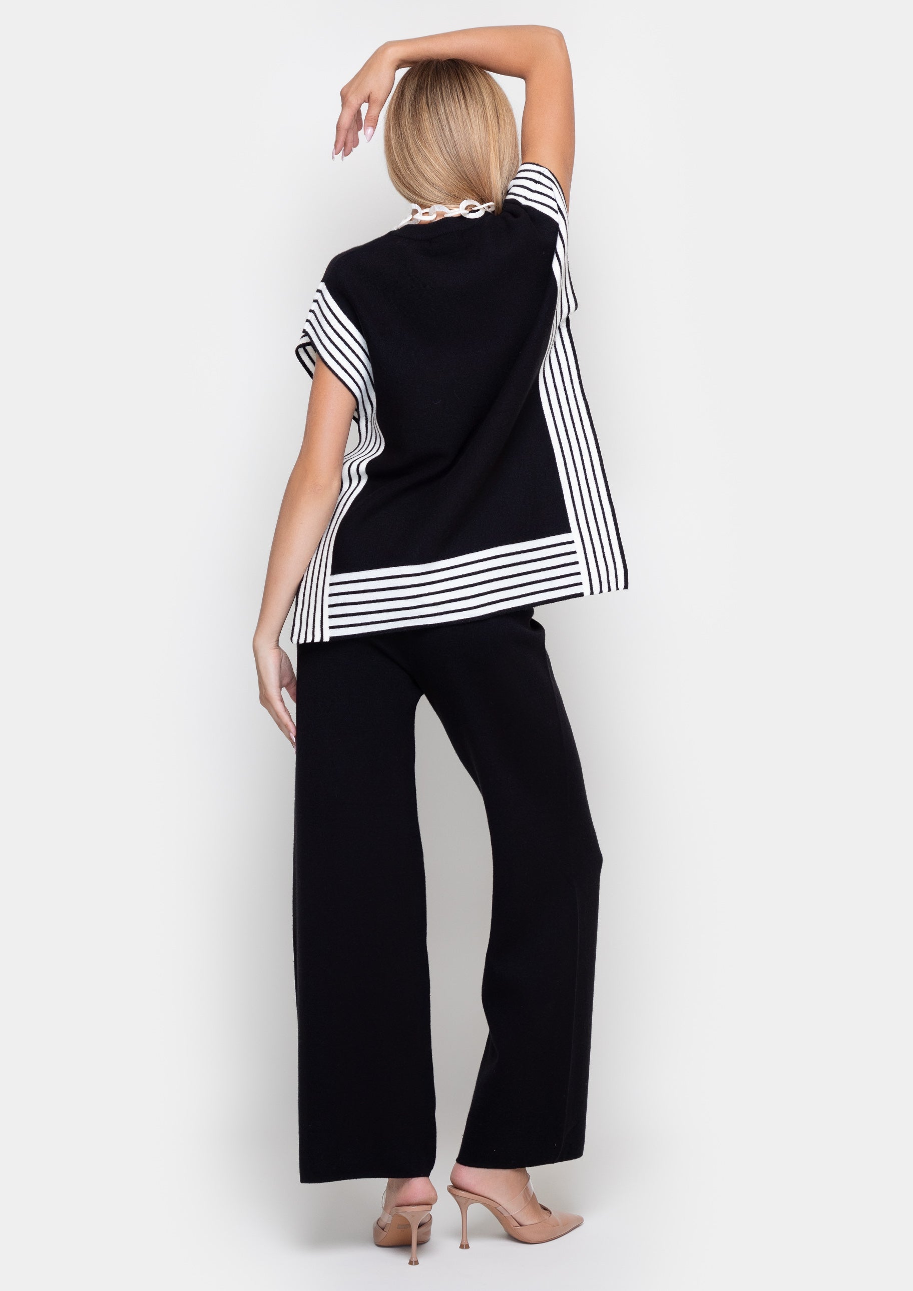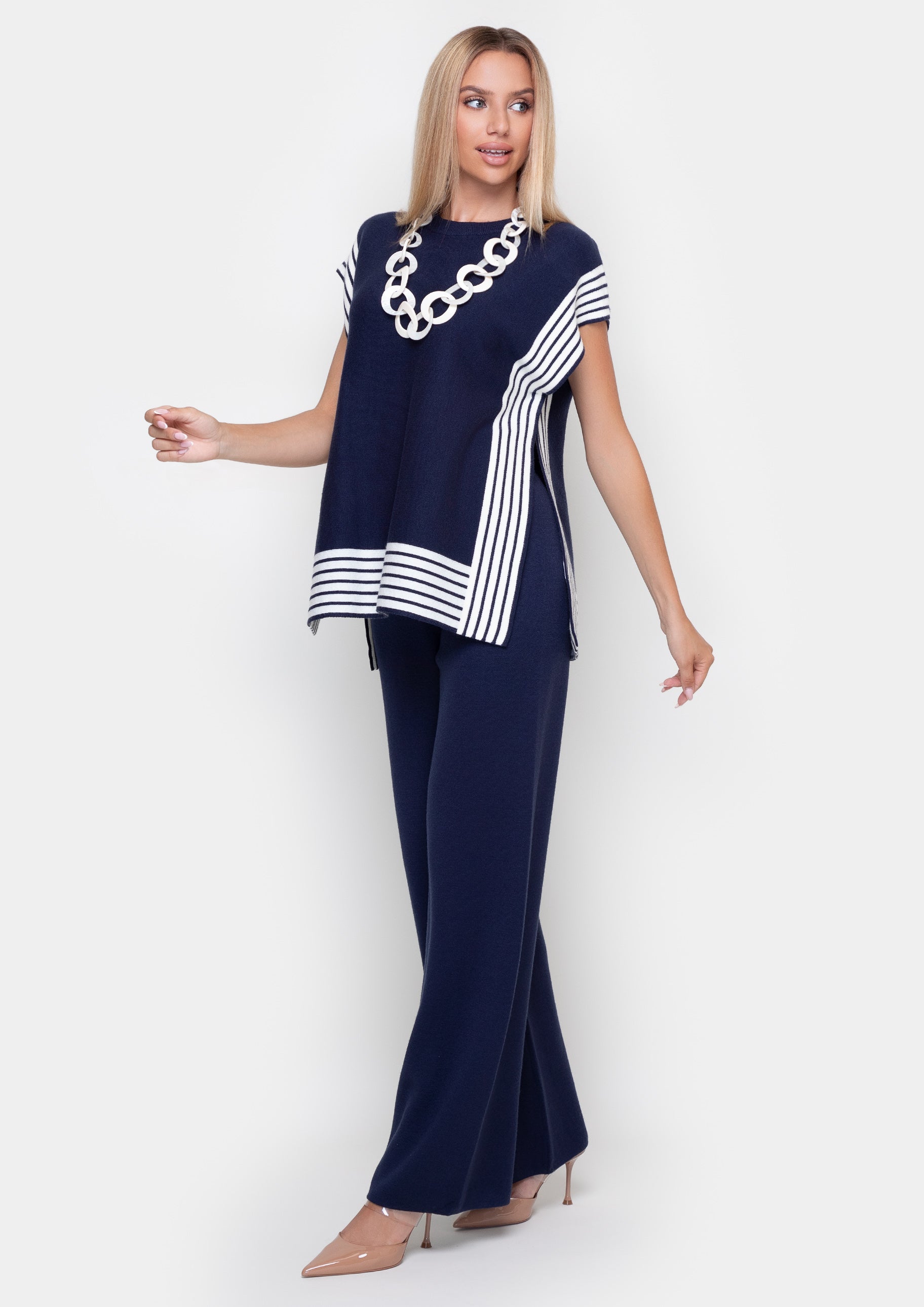 Стильний трикотажний костюм із вільним верхом та широкими штанами, розроблений для максимального комфорту та сучасного вигляду. Верх має просторий крій та смугасті акценти на рукавах та краях, що додають образу свіжості та динаміки. Штани мають вільний крій, що забезпечує свободу рухів та комфорт протягом дня. Цей костюм ідеально підходить для щоденного носіння або неформальних зустрічей, підкреслюючи ваше почуття стилю та впевненість.