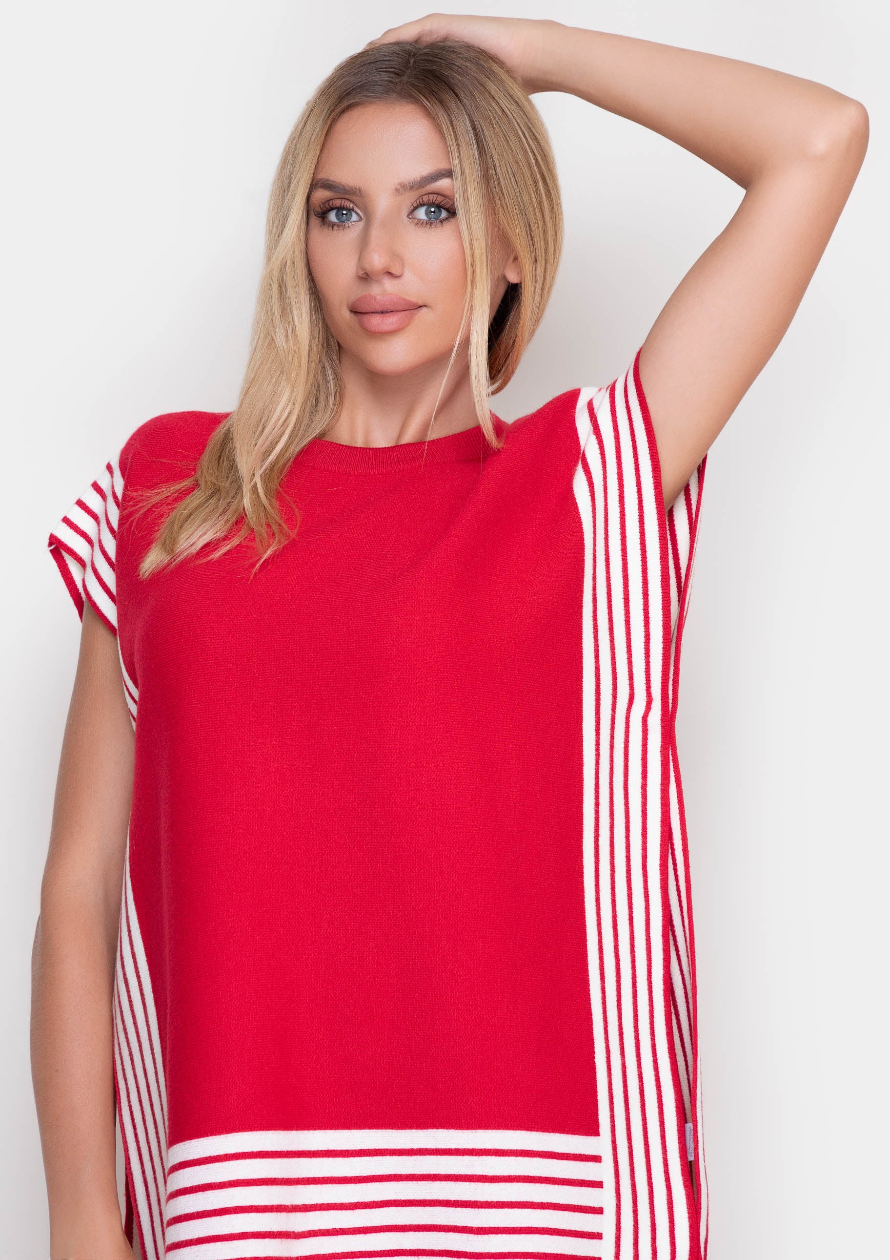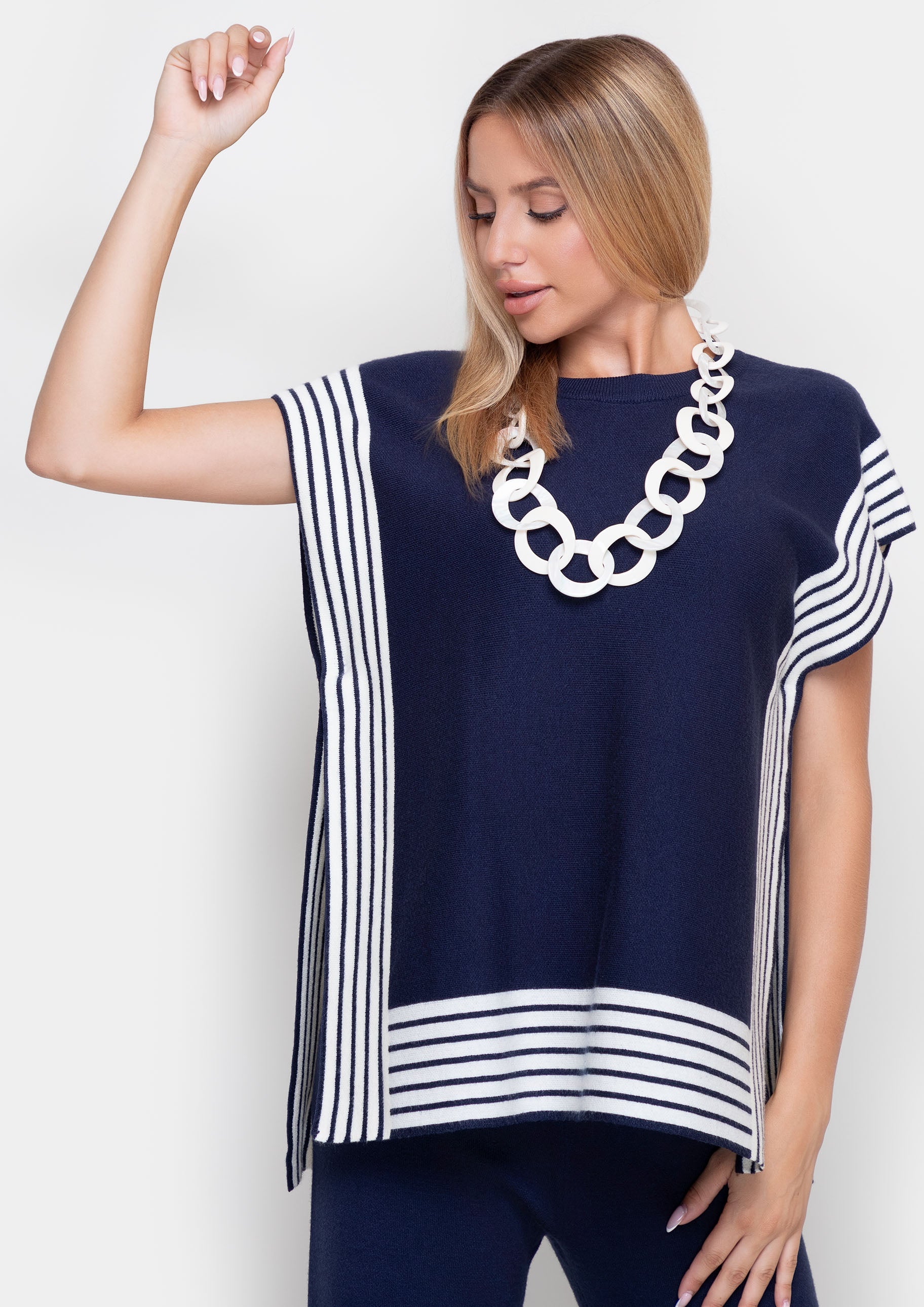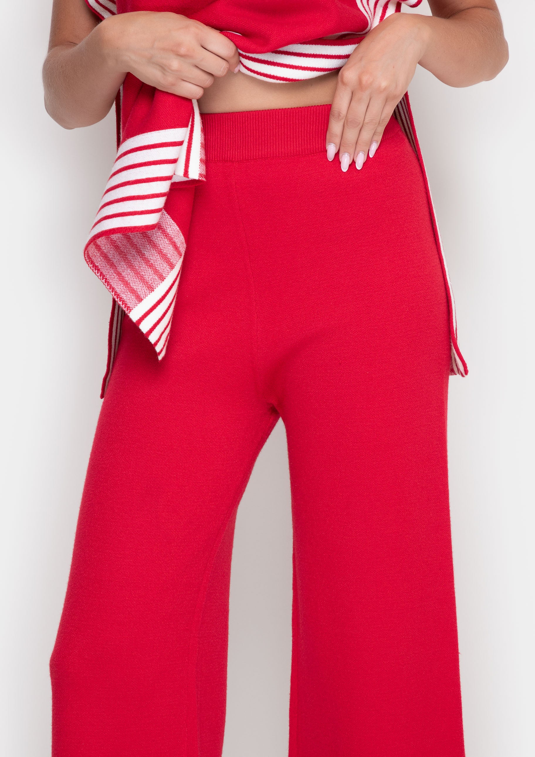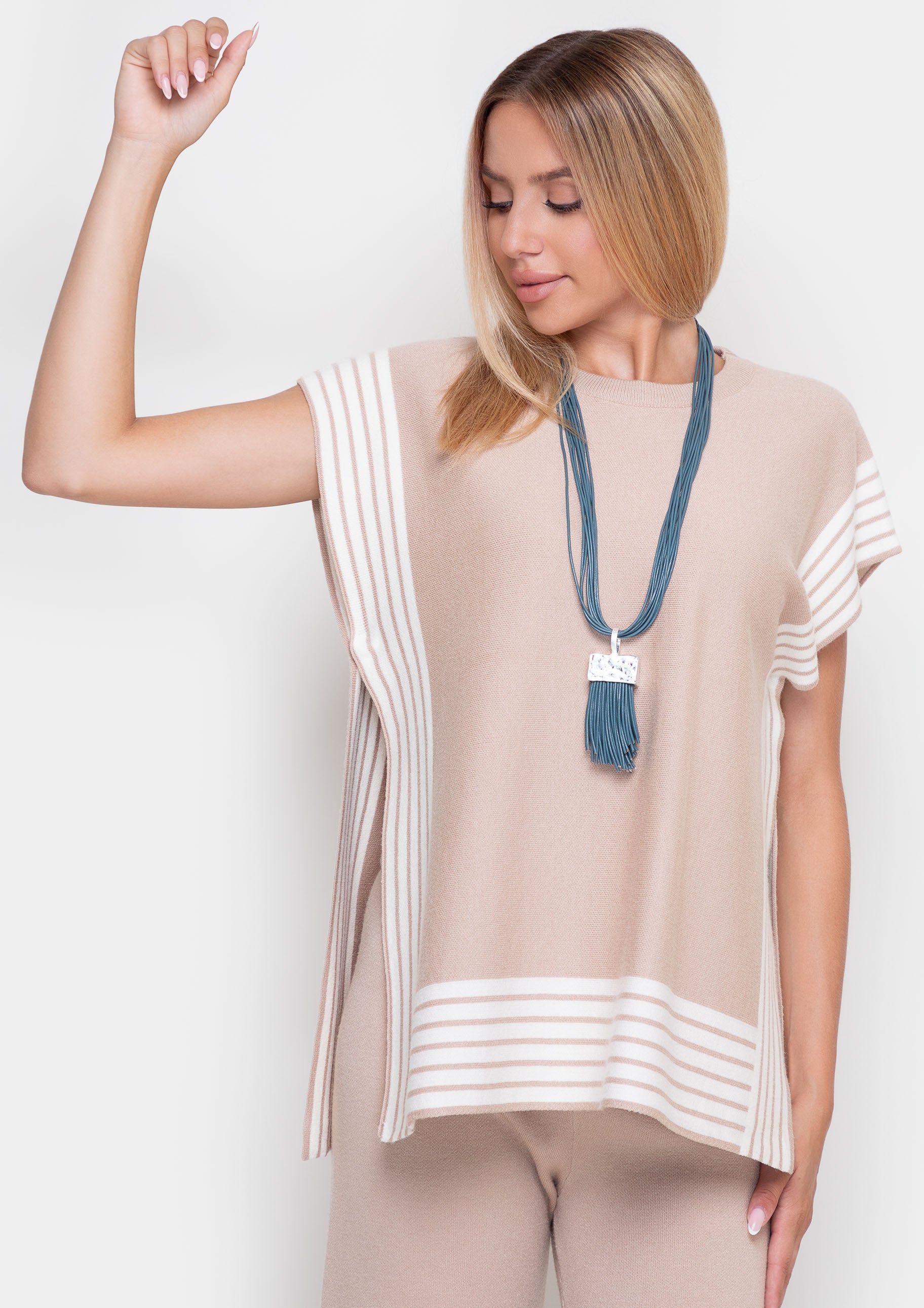 Стильний трикотажний костюм із вільним верхом та широкими штанами, розроблений для максимального комфорту та сучасного вигляду. Верх має просторий крій та смугасті акценти на рукавах та краях, що додають образу свіжості та динаміки. Штани мають вільний крій, що забезпечує свободу рухів та комфорт протягом дня. Цей костюм ідеально підходить для щоденного носіння або неформальних зустрічей, підкреслюючи ваше почуття стилю та впевненість.